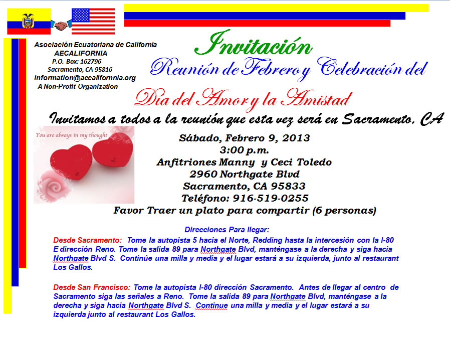The Ecuadorian Association of California (AECalifornia) has its headquarters in the City of Sacramento, California. It is organized as a Non-Profit Organization. The primary purpose to join and organize Ecuadorians, their families and friends or other nations that live in California. So that jointly we can carry on projects of assistance to those in need in Ecuador and in the United States. AECalifornia carries on its objectives by social activities, intellectual, cultural, sports and events of service to the community. The organization is open to the public at large and welcomes anyone who shares our ideas and not for profit activities, our mission and objectives. We get together each first Saturday of each month hosted by one of our members.
